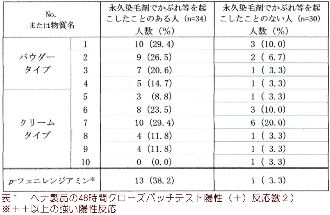 また、永久染毛剤でかぶれ等を起こしたヒト(34名)のうちヘナの使用経験がある人(10名)を除いた24名では、ほとんどの銘柄に陽性反応が出ており、ヘナの使用経験がなくてち永久染毛でかぶれ等を起こしたことのあるヒ卜は、今回のような製品でもかぶれ等を起こす可能性があり、使用する際には注意が必要である。